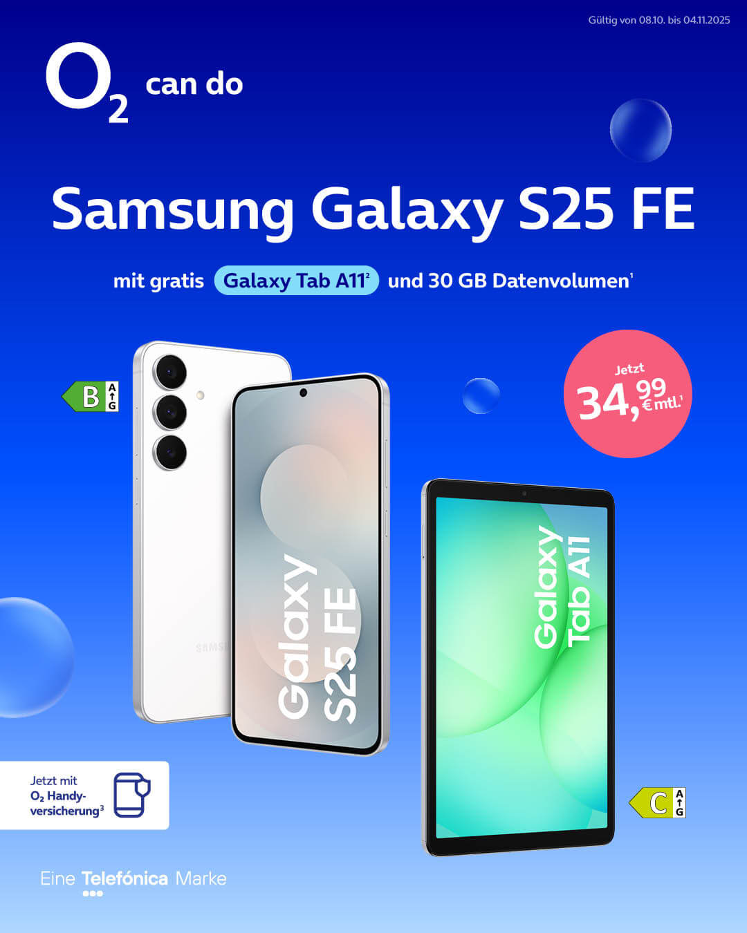 Hol dir jetzt das Samsung Galaxy S25 FE im o2-Tarif mit 30 GB Datenvolumen pro Monat und erhalte das Galaxy Tab A11 gratis dazu. 🤩