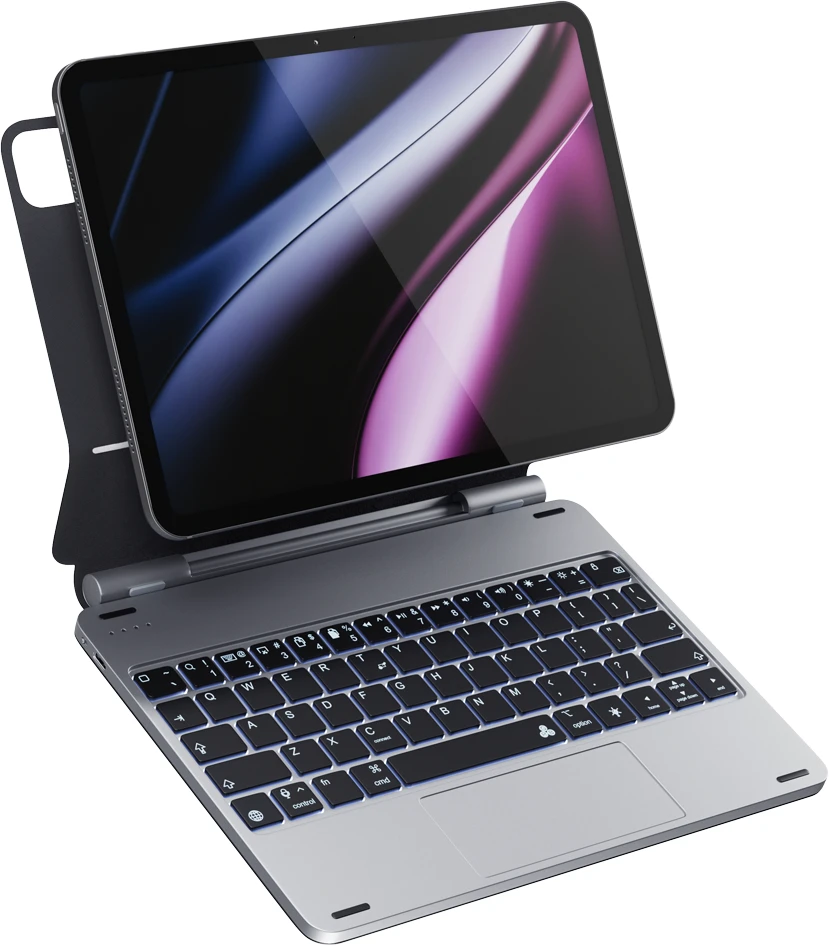 Epico Aluminium Keyboard Case ist das perfekte Zubehör für Ihr iPad, das sich kabellos über Bluetooth verbinden lässt. Die Hülle ist aus einem Alu-Gehäuse und PU-Leder gefertigt und bietet zuverlässigen Halt für Ihr Tablet. Die Hülle dient auch als Ständer, der Ihr iPad im idealen Winkel hält, so dass Sie ihn als Monitor verwenden können. Das Multi-Touch-Trackpad, das auf das Antippen auf der gesamten Oberfläche reagiert, erleichtert die Bedienung. Die hintergrundbeleuchtete Tastatur verfügt über sieben Farben mit einstellbarer Helligkeit und zahlreiche Tastenkürzel, wie z. B. die Tasten zum Kopieren/Einfügen. Die Tastatur hat eine lange Akkulaufzeit (bis zu 3 Monate im Standby-Modus) und lässt sich separat aufladen. Im Lieferumfang enthalten ist ein USB-C auf USB-C-Kabel.